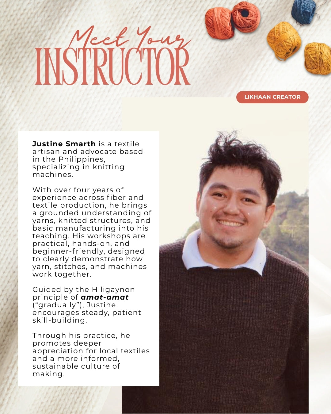 Justine Smarth is a textile artisan and passionate advocate for Philippine textiles, specializing in knitting machine work. With over four years of experience in the textile industry, he has worked across multiple stages of production—from fiber to finished fabric—developing a grounded understanding of yarns, knitted structures, and basic textile processes. His workshops are practical, hands-on, and especially welcoming to beginners, offering clear guidance on how yarn, stitches, and machines work together in harmony.