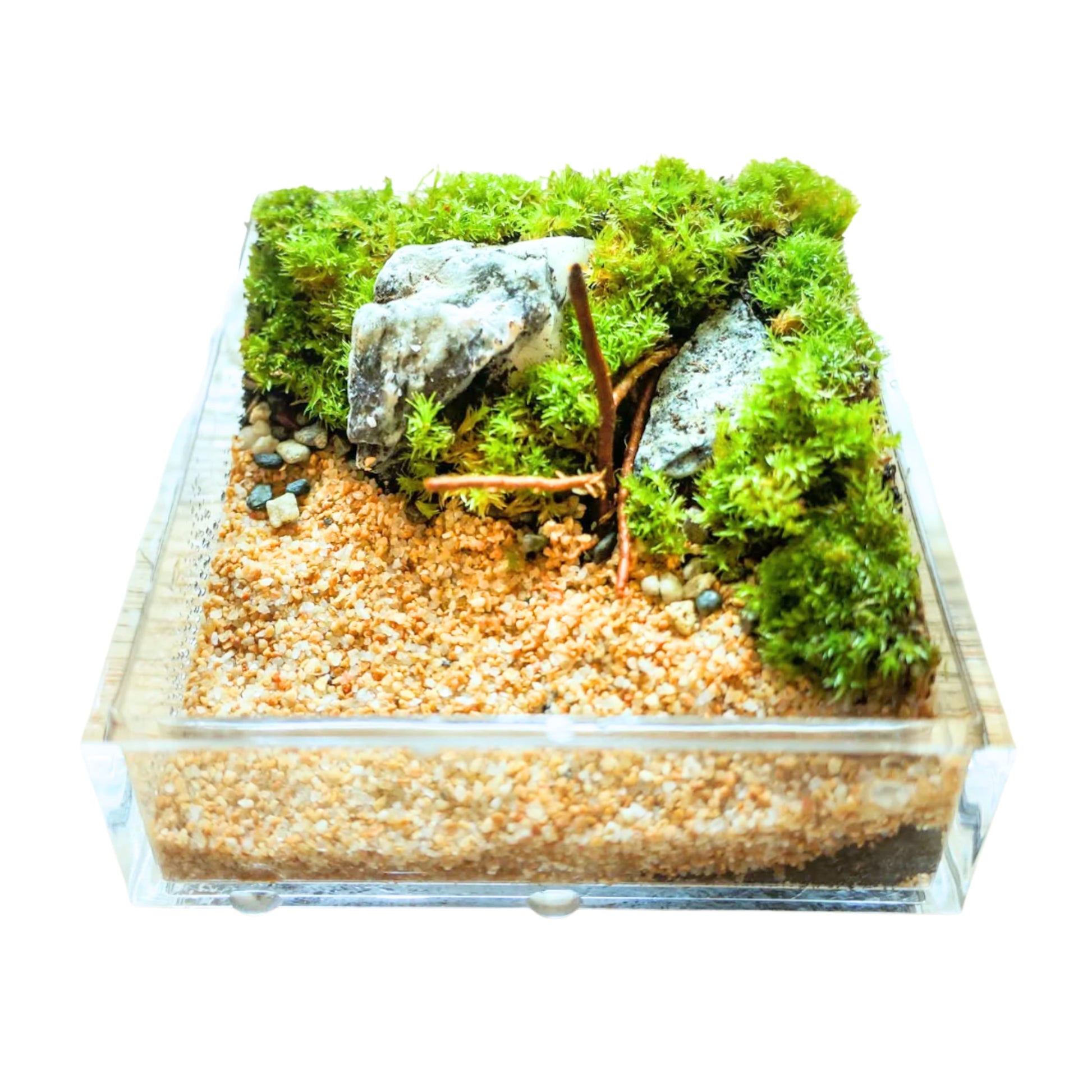 MATERIAL: Acrylic container, drainage layer, substrate, hardscape, live moss