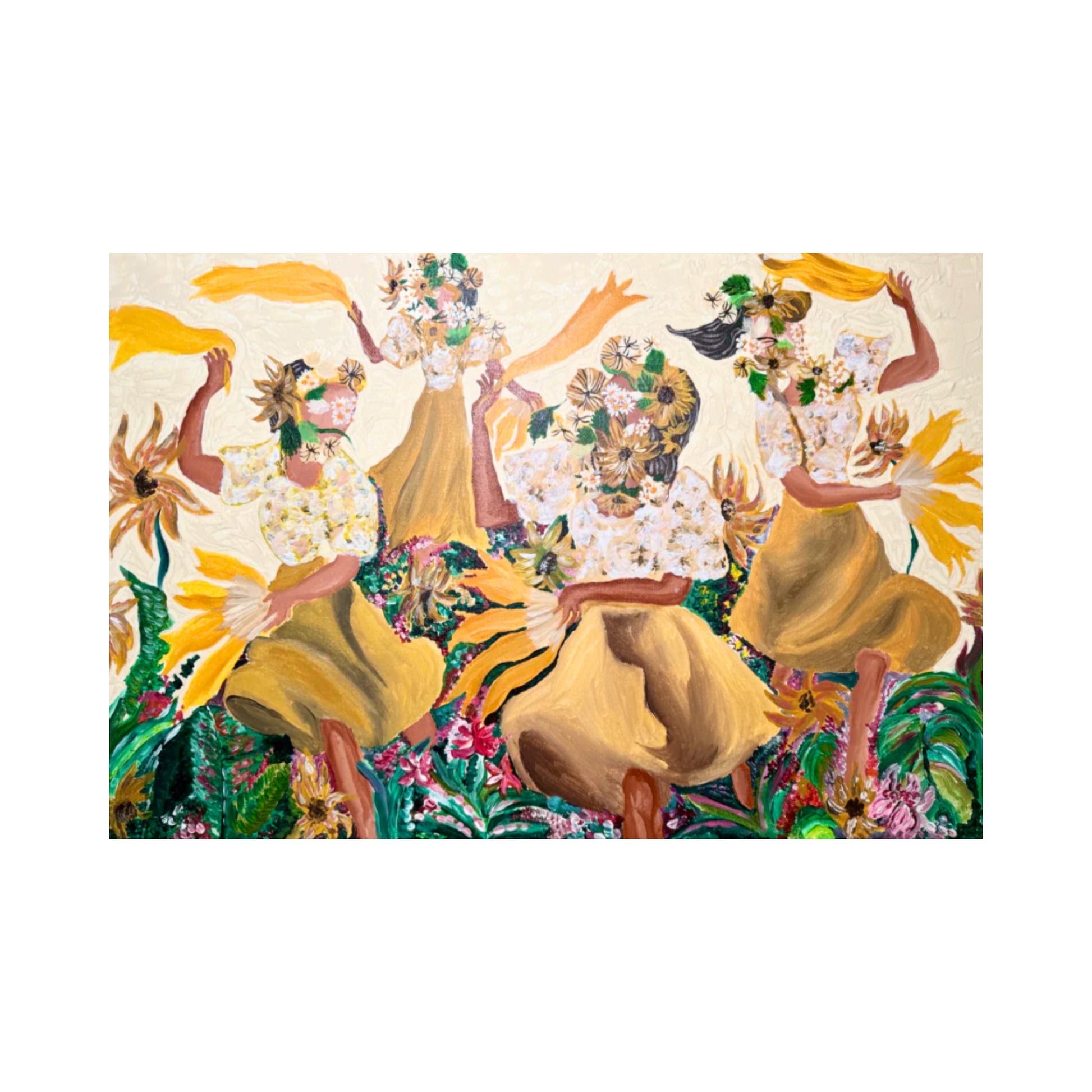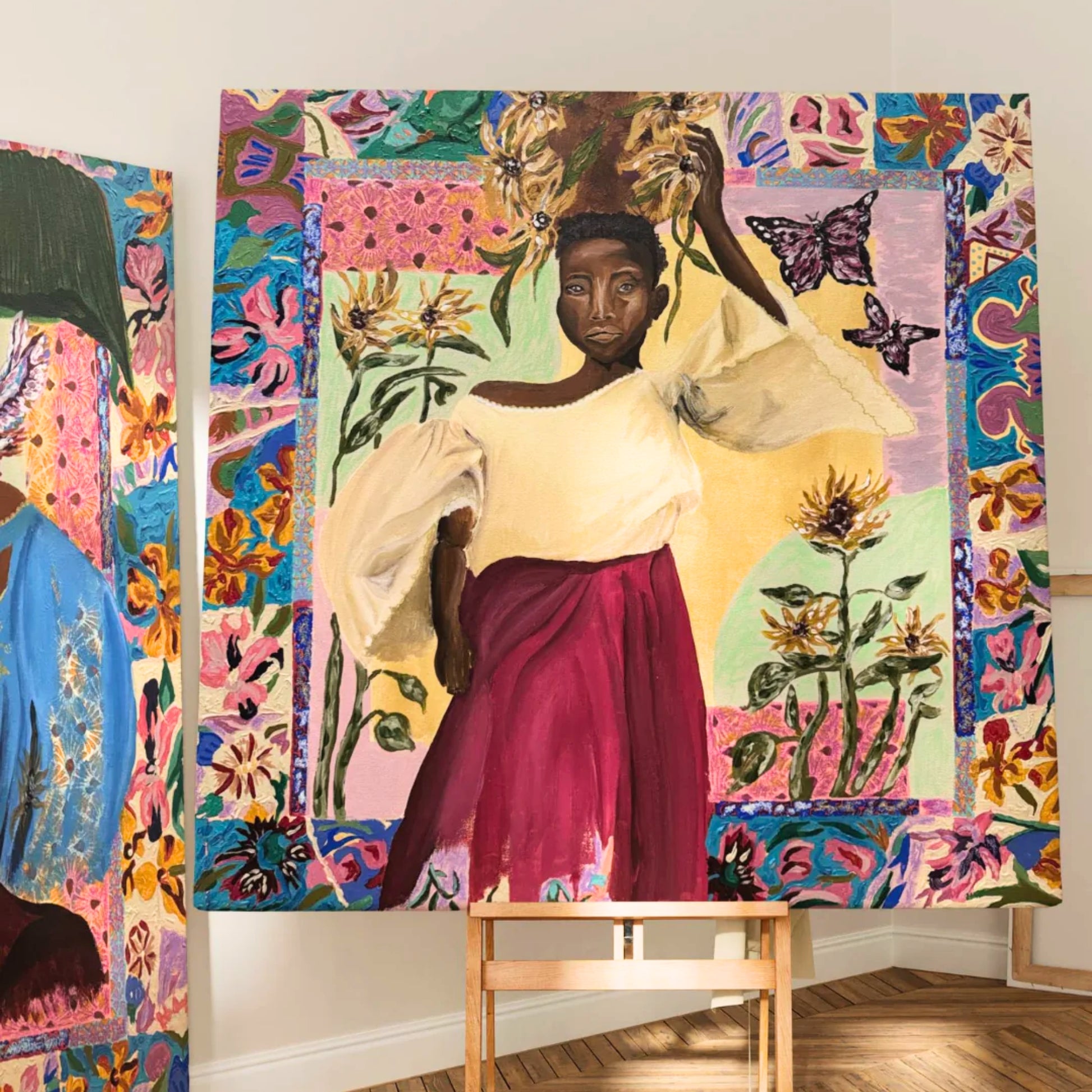 Her artistic style is characterized by expressive figures that capture powerful gestures, symbolizing self-love and strength. Alongside these, she incorporates soft, ethereal compositions that evoke healing and hope, as well as bold, vibrant colors that radiate positivity and joy. Each piece she creates reflects a deep connection to the emotions that shape human life.