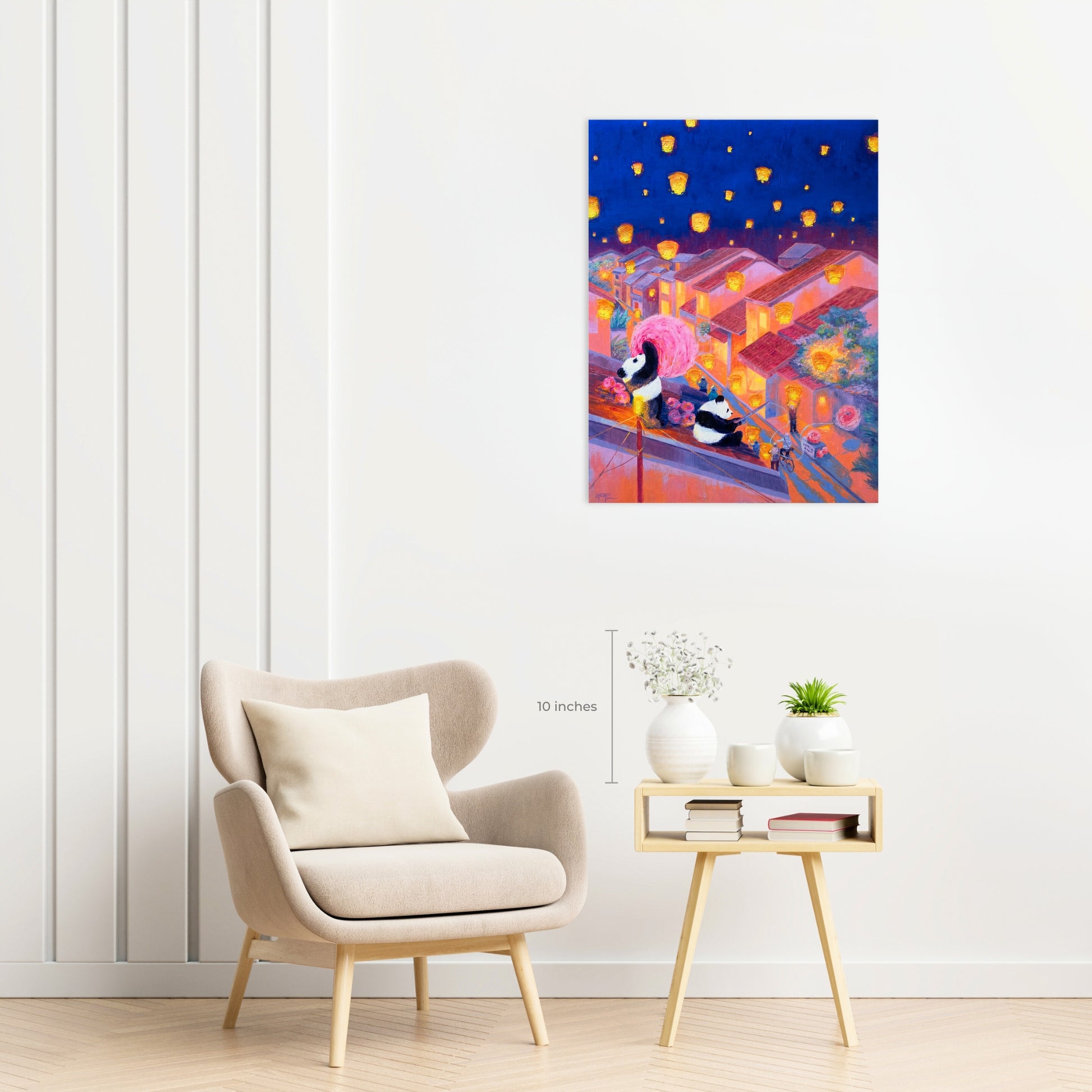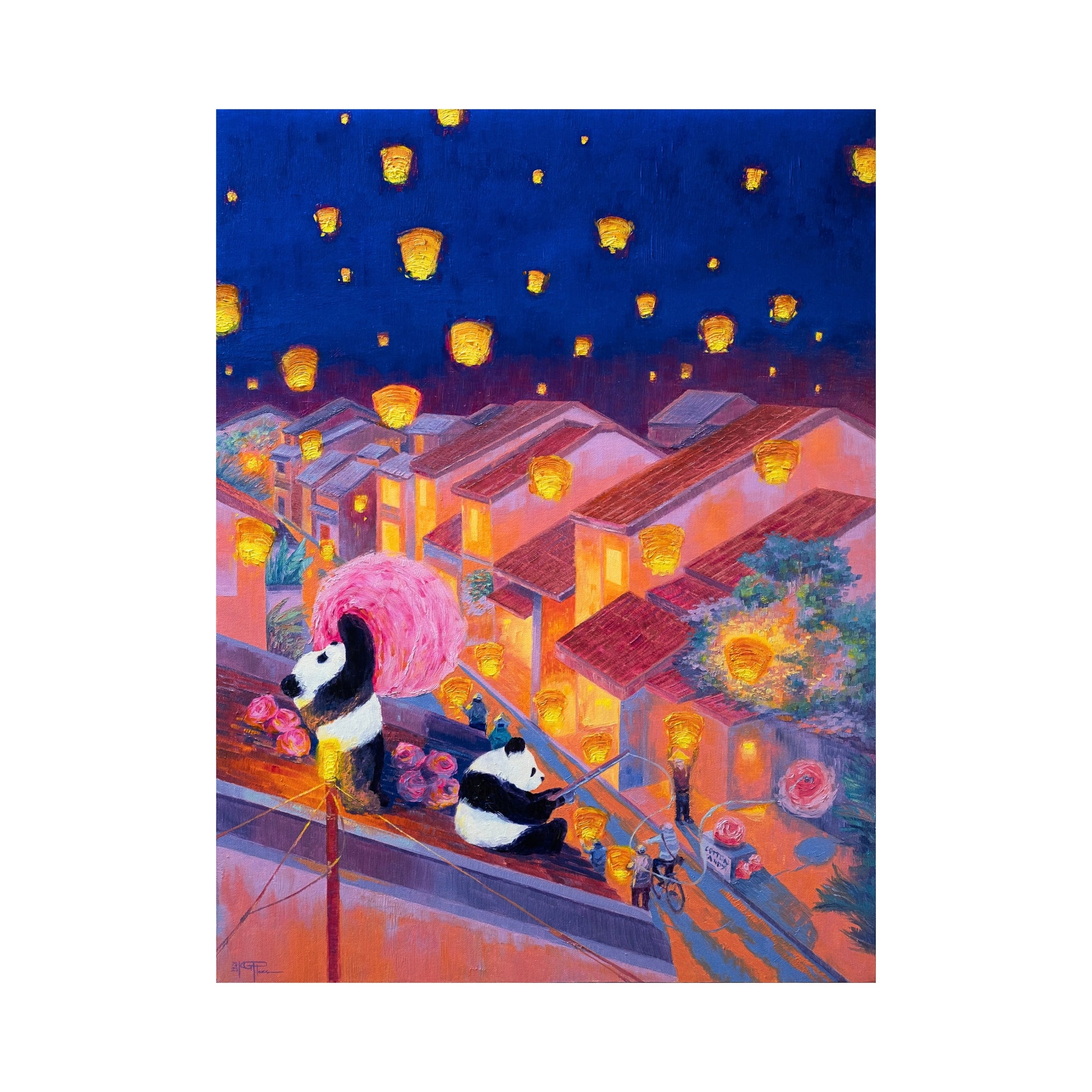Experience a captivating scene where pandas gracefully gather atop rooftops in Vietnam, releasing lanterns that illuminate the night sky.