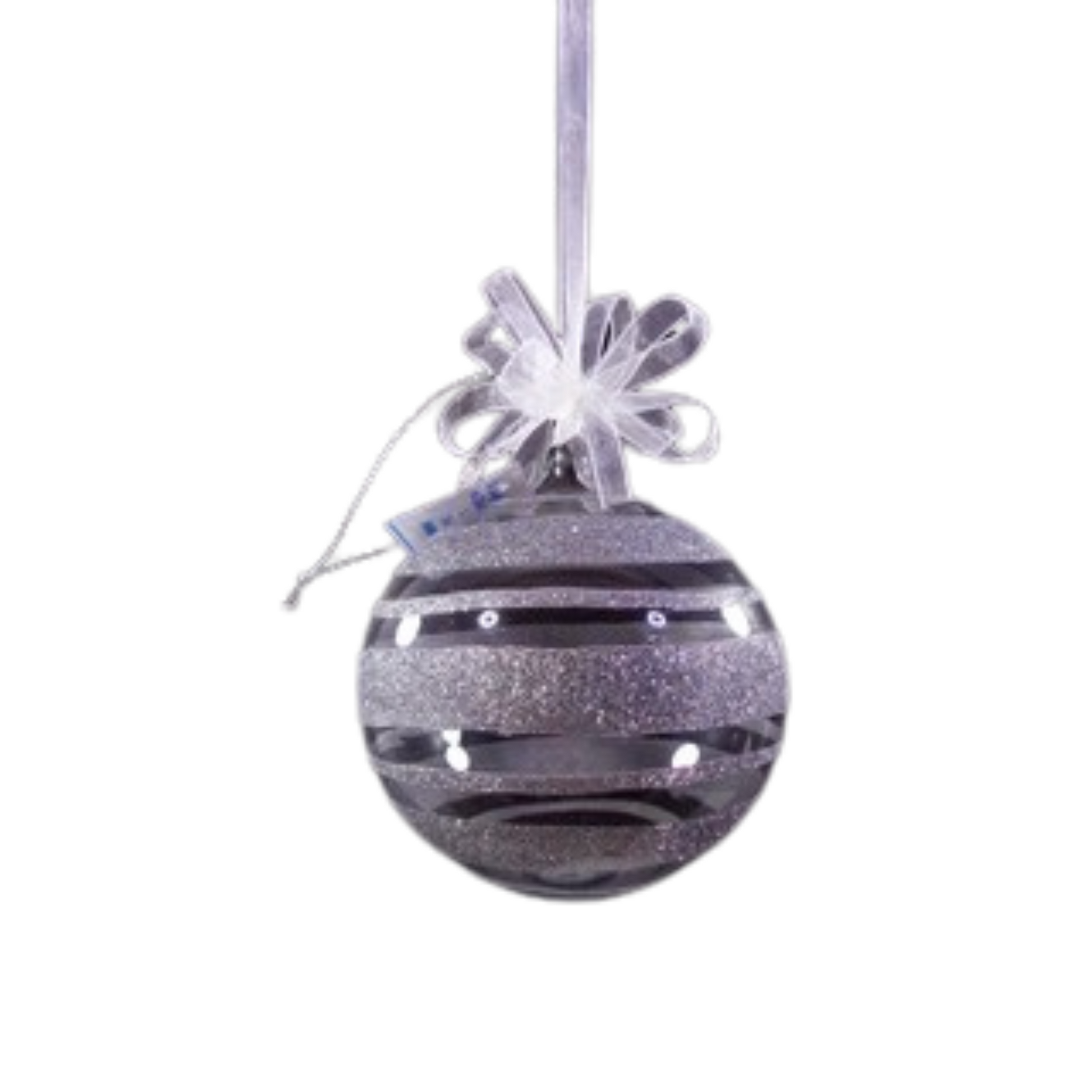 Take your Christmas tree to the next level with this set of 6pc Glass Ball Ornaments! These glimmering decorations feature a sleek silver glitter design and are adorned with delicate organza ribbons. Add some daring flair to your holiday decor with these must-have pieces for the festive season!