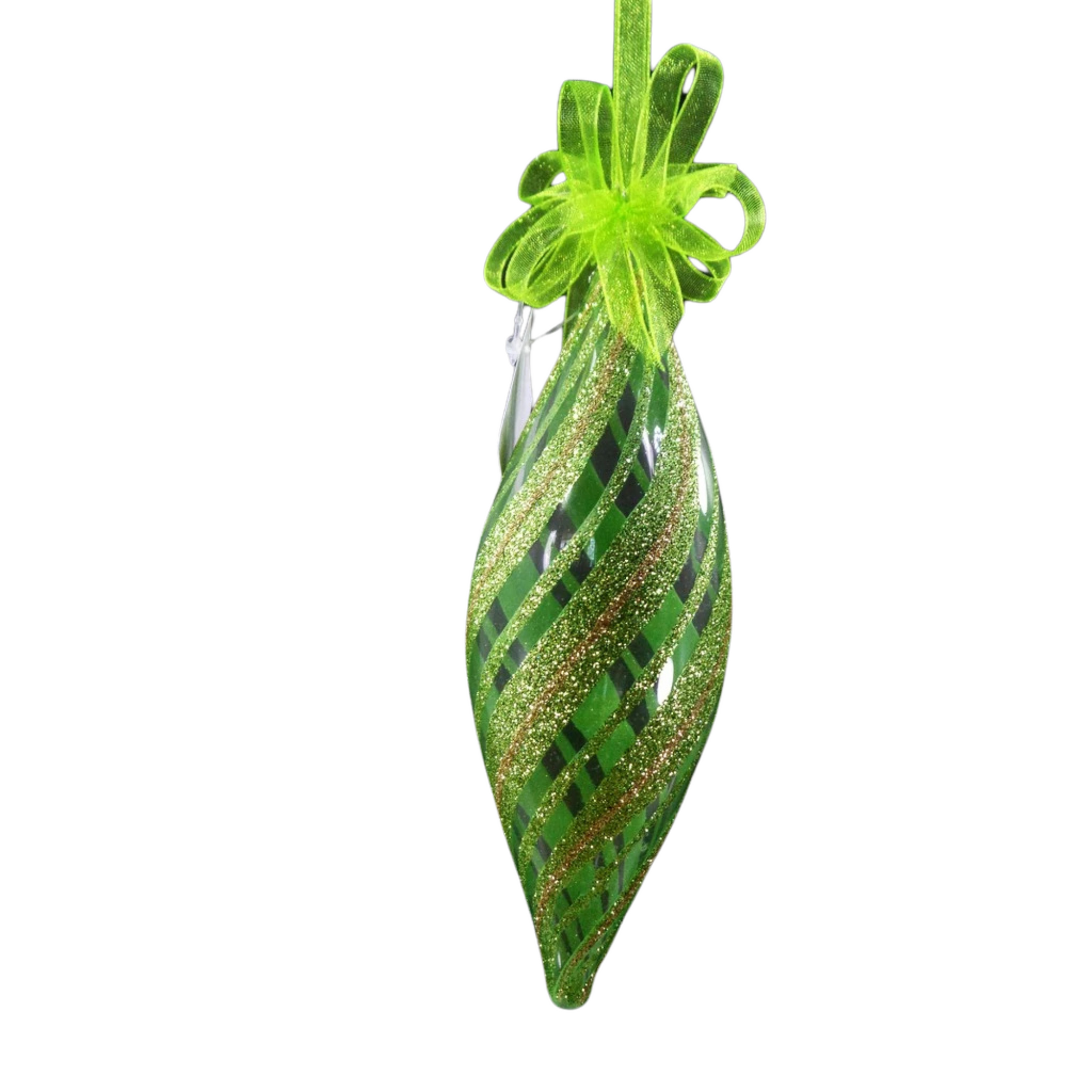 Elevate your holiday decor with our Set of 6 Glass Christmas Oval Ornaments! Adorned with a stunning green glitter design and delicately tied with organza ribbon, these ornaments add a touch of elegance to any Christmas tree.