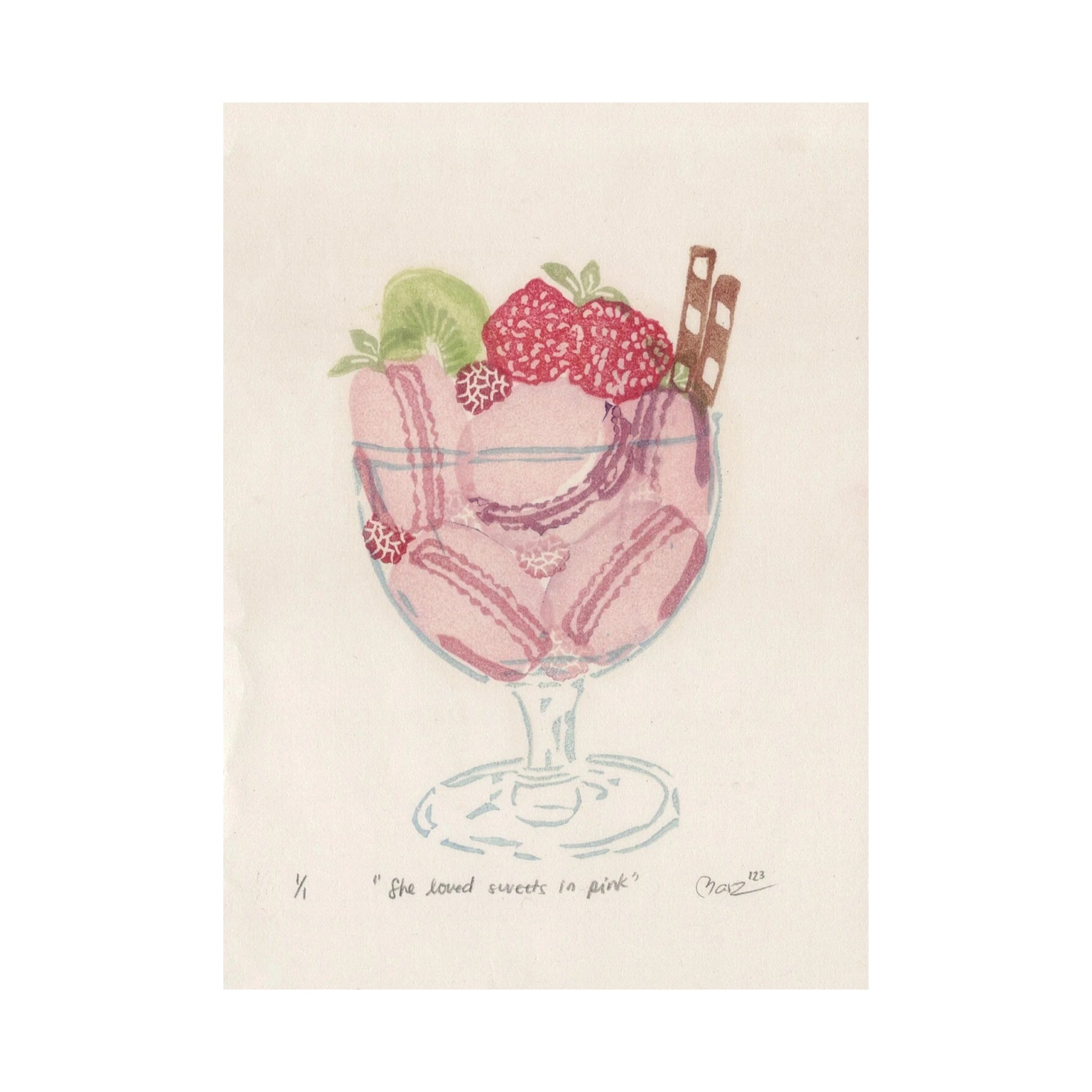 This hand stamped print, "She Loved Sweets in Pink", captures whimsical and sweet moments in a delicate pink hue.