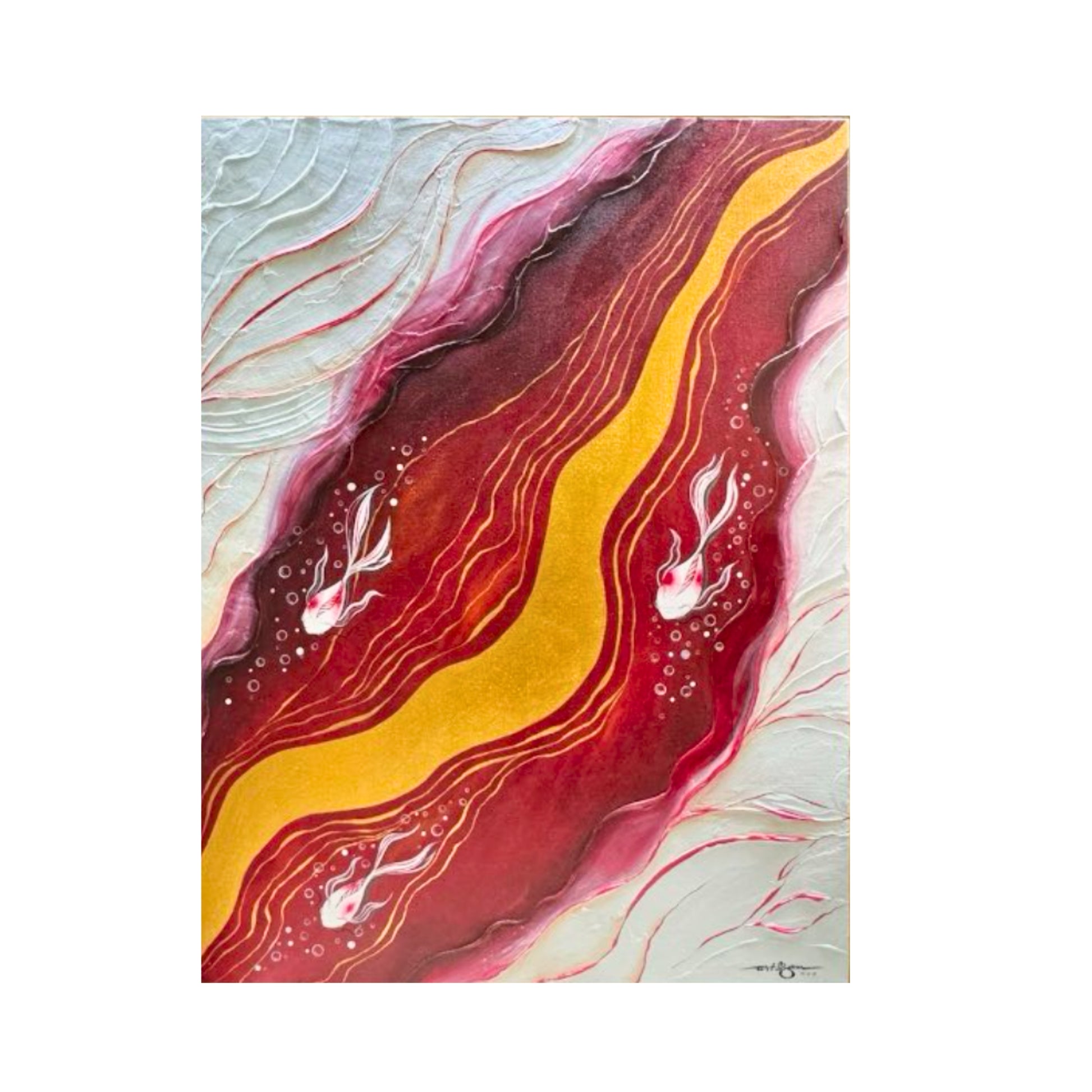 Tres Suertes (Rojo) captures the profound symbolism of three koi fish, representing the stages of life—birth, marriage, and death—and the enduring journey from beginning to end.