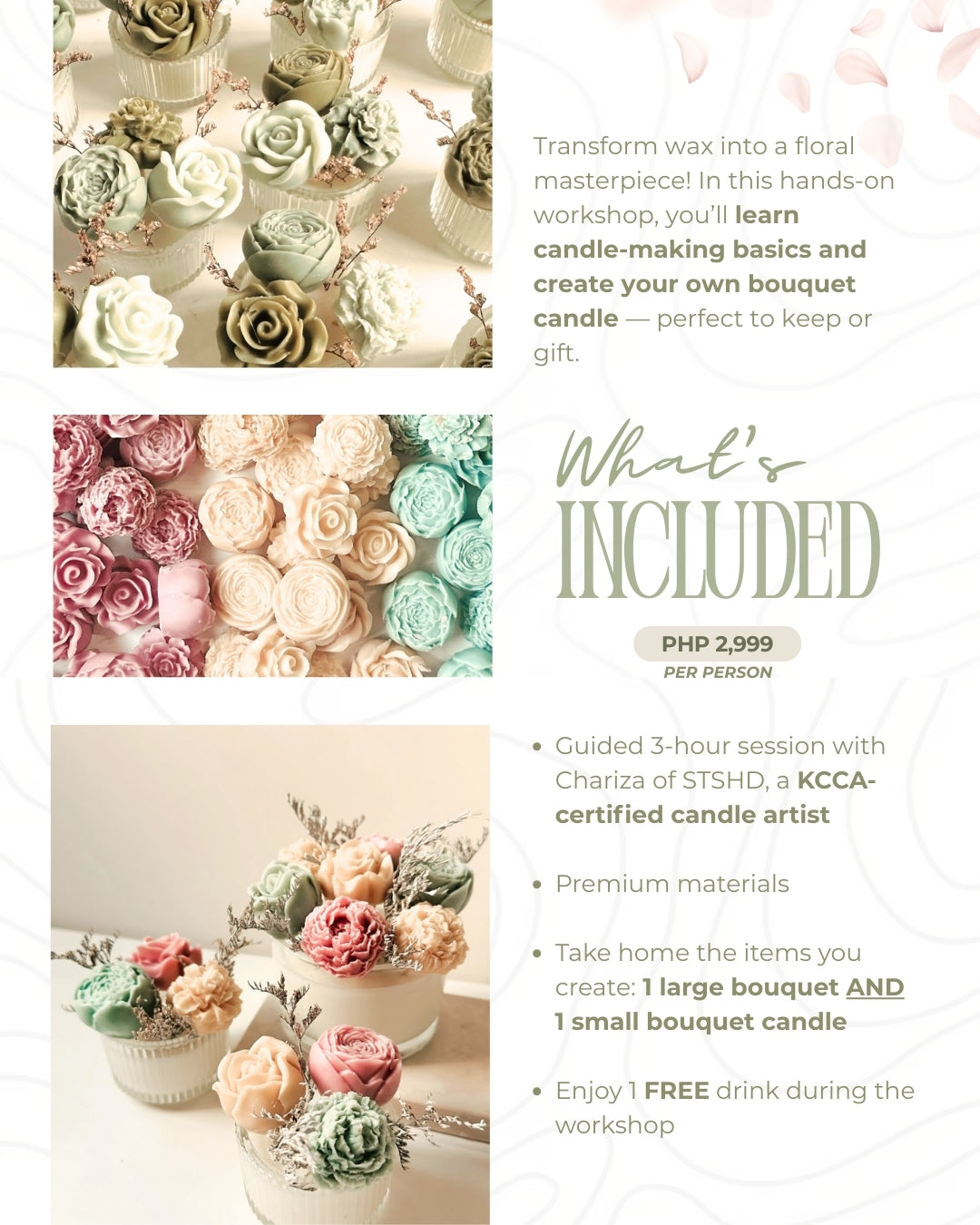 Join Bloom in Wax: Bouquet Candle Workshop this September 13: a unique, beginner-friendly session where you’ll learn the fundamentals of candle-making, guided by Chariza Franchesca Roasa-Barcenas, founder of STSHD and a KCCA-certified candle artist.