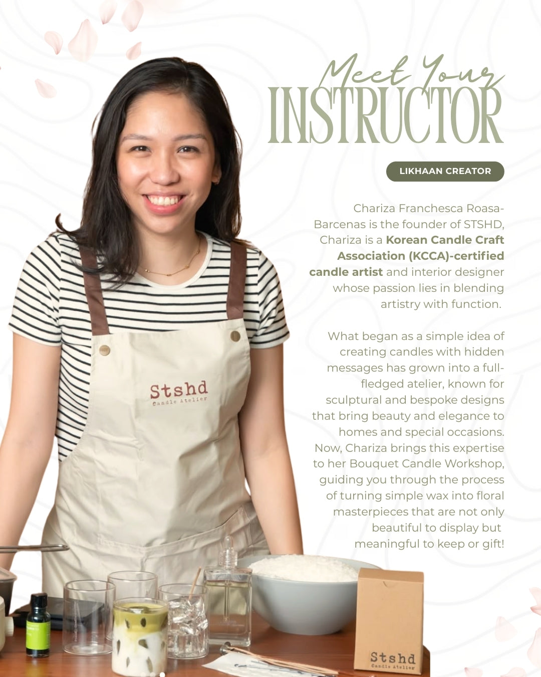 Over the years, STSHD has expanded from classic vessels to include moulded, sculptural, and custom creations, each designed to elevate interiors with a luxurious aesthetic. Drawing from her professional background in interior design and her certification from the Korean Candle Craft Association (KCCA), Chariza brings expert craftsmanship into every piece. Today, STSHD not only produces exquisite candles but also offers workshops and customized arrangements for events, creating meaningful and lasting experiences that blend fragrance, artistry, and design.